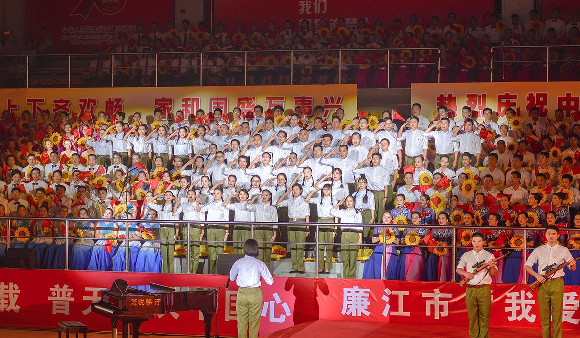 展演最后,林海武、李世東、吳永光等市領(lǐng)導(dǎo)走上舞臺(tái),和全場(chǎng)觀眾一起高歌《歌唱祖國(guó)》,祝愿?jìng)ゴ笞鎳?guó)繁榮昌盛,祝福廉江的明天更加美好。