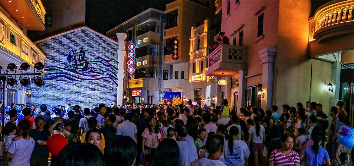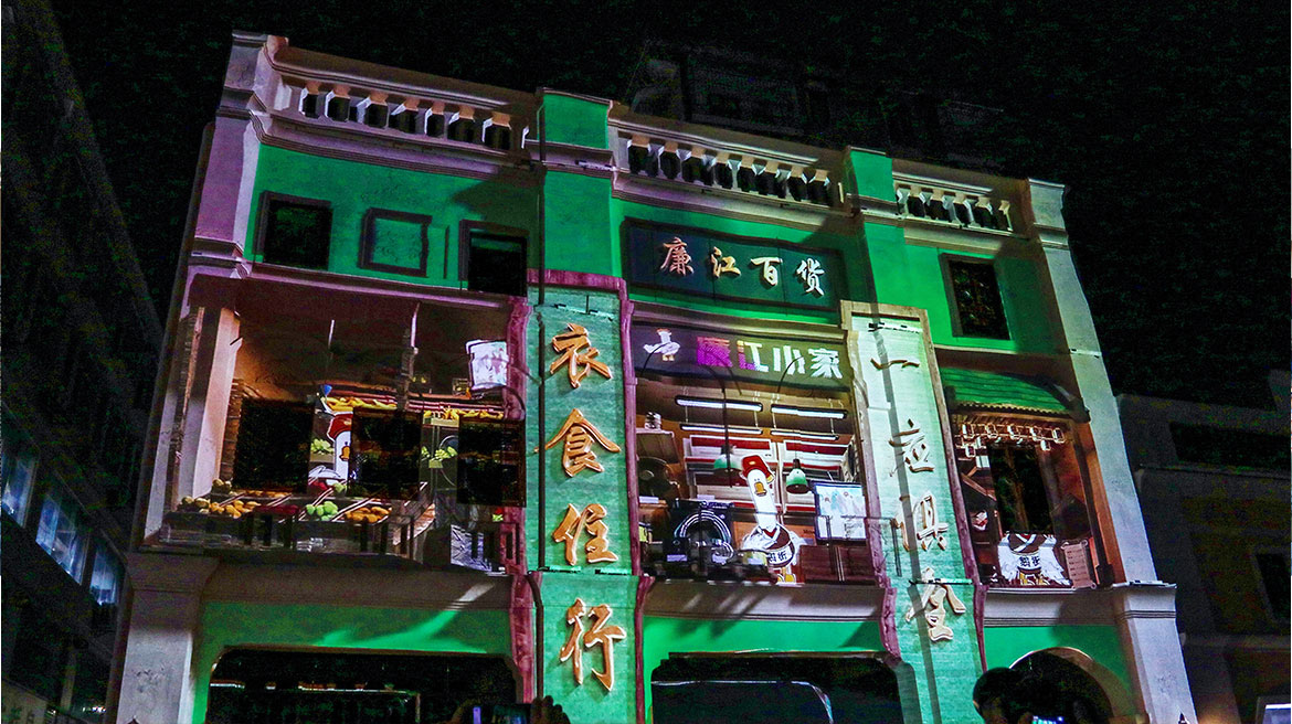 改造后的廉江鵝街在絢麗的燈光秀表演下